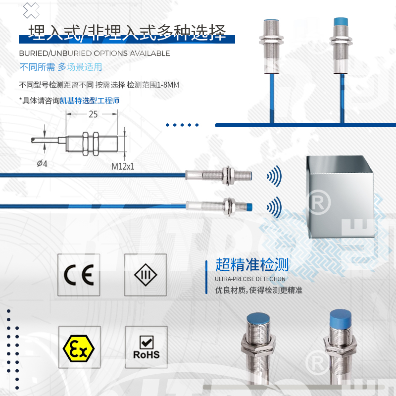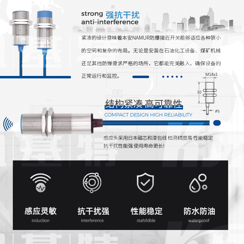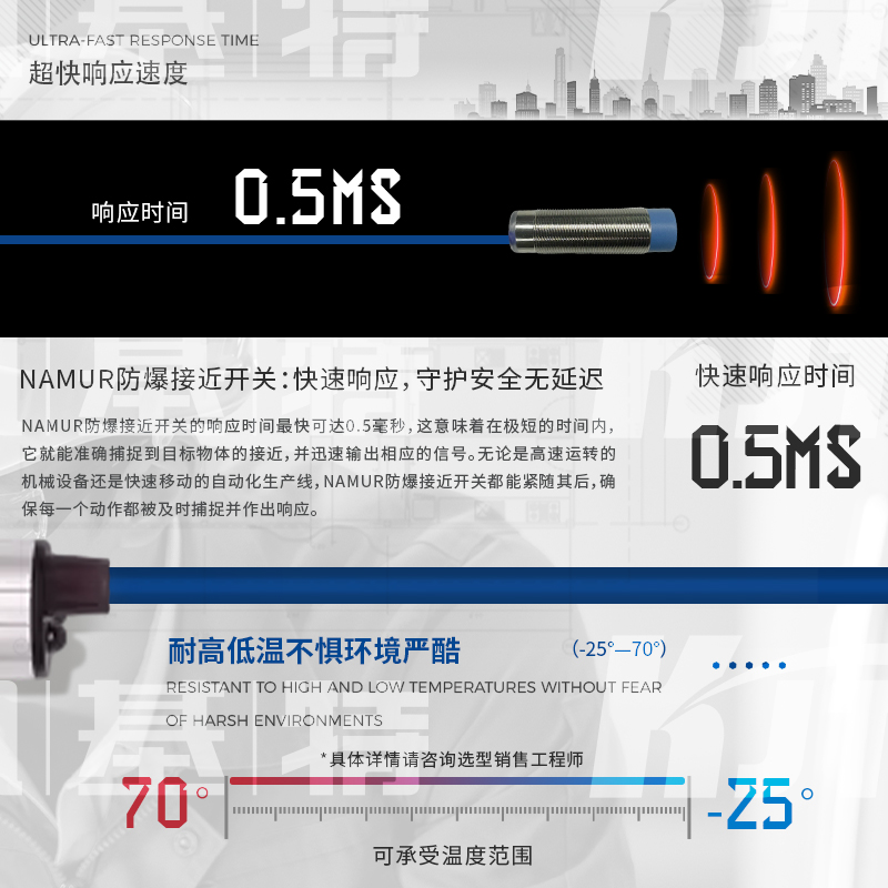 凱基特本安NAMUR接近開關主要應用于需要防爆的場合設備和環(huán)境,如煤礦、石化等, NAMUR信號為世界上應用最廣泛的本質安全的數(shù)字量輸入和頻率量輸入的標準信號。其最早為德國標準(?DIN19234?)。后成為歐洲標準(?EN?50227,DIN?EN?60947-5-6?)。NAMUR信號為無源2線制,標稱8VDC供電,1mA?和3mA開關信號。NAMUR型傳感器均為本質安全防爆儀表,通常與隔離式安全柵配合使用。